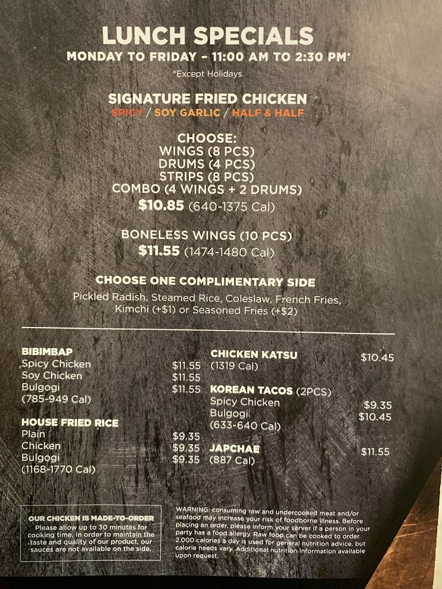 Wings & Drumsticks, double fried with your choice of sauce. Complimentary side of pickled radish or coleslaw.